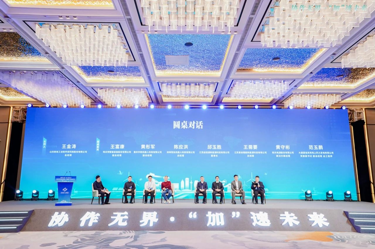 埃夫特智能装备股份有限公司副总经理王富康、重庆华数机器人科技有限公司副总经理黄彤军、深圳怪虫机器人科技有限公司总经理陈应洪、江苏益佳通新能源科技有限公司董事长邱玉胜、江苏景创锂能新能源科技有限公司总经理王需要、阳光电源股份有限公司解决方案经理黄守彬、大唐国信滨海海上风力发电有限公司党委副书记副总经理总工程师范玉鹏共同参与,并就新能源行业未来走向,机器人解决方案现状、合作现状、升级创新方向、合作路径等议题同台共话。本次对话由山东新松工业软件研究院股份有限公司总经理王金涛主持。