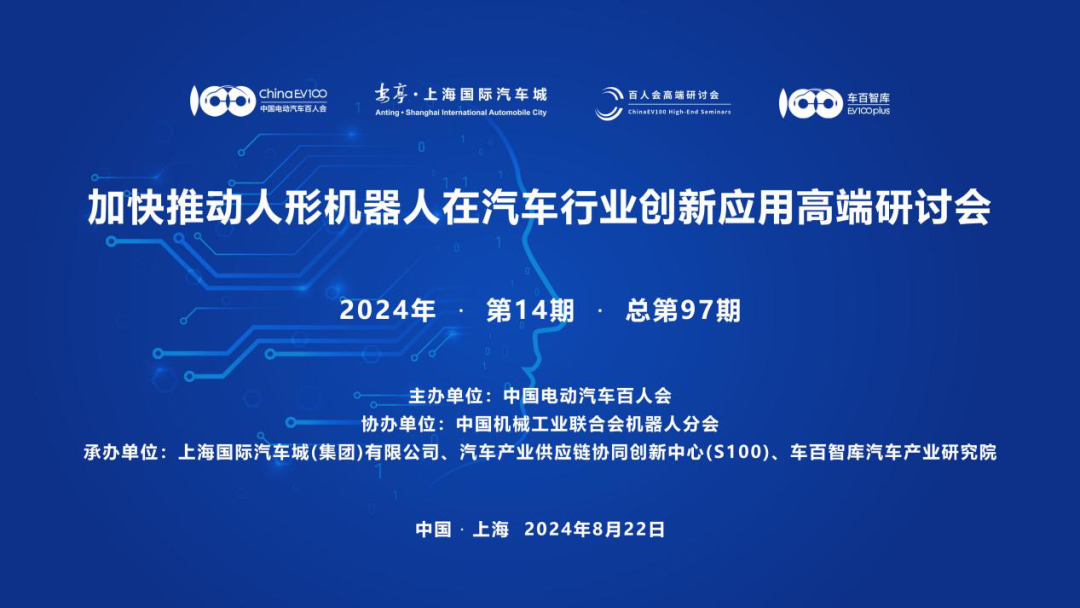 8月22日,由中国电动汽车百人会主办,中国机械工业联合会机器人分会协办,上海国际汽车城(集团)有限公司、汽车产业供应链协同创新中心(S100)、车百智库汽车产业研究院共同承办的“加快推动人形机器人在汽车行业创新应用”高端研讨会,暨百人会2024年第14期(总第97期)高端研讨会,在上海嘉定顺利召开。研讨会由百人会副秘书长师建华主持。