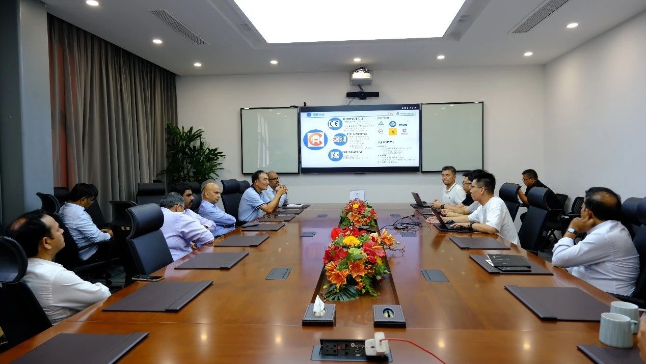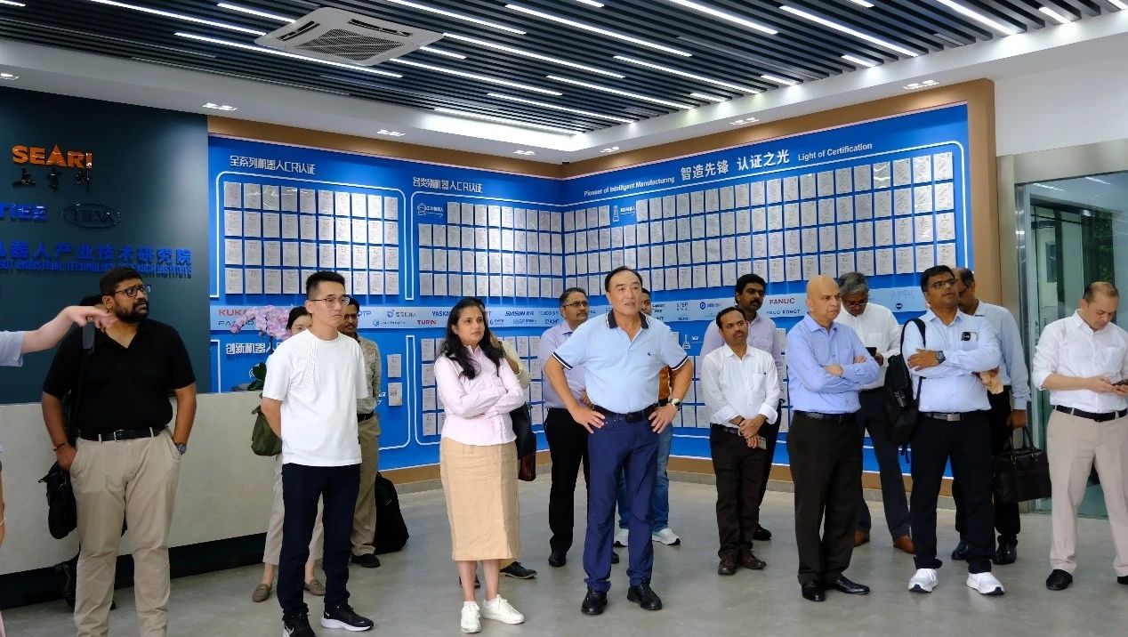7月24日,印度塔塔集团(Tata Group)代表团一行到访研究院(中国)机器人有限公司官网(以下简称”上研院“),实地参观机器人检测试验室、智能创新研发实验室、具身智能机器人数据训练测评试验室,重点了解国家机器人检测与评定中心(总部)职能、行业标准制定与检测认证服务等工作进展,并就中国机器人认证(以下简称”CR认证”)体系及国际互认机制展开深入交流,上研院副院长周梅杰热情接待。