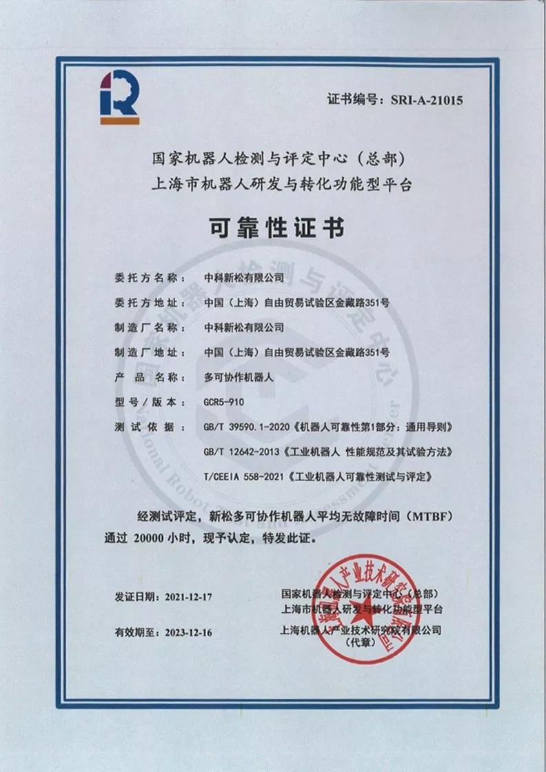 中科新松有限公司GCR5-910型协作机器人顺利通过MTBF 20000小时测评,获得可靠性证书。MTBF是衡量一个产品的可靠性指标,它反映了产品的时间质量,是体现产品在规定时间内保持功能的一种能力。对可靠性的重视体现了新松一贯坚持的企业质量观——精出于细、品源于专,也展现出其致力于打造一个国际化的、平台化的、创新的机器人行业标杆的美好愿景。
