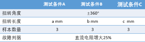 在2D扭转试验中,进行3组不同扭转长度的电缆寿命试验,失效判据定为直流电阻变化率小于25%,可分别得到3组应力下的寿命。使用加速模型分析可得到不同应力的加速因子。例如扭转长度20cm和30cm对应的加速因子可达到X倍以上,也就是30cm对应的寿命为20cm扭转寿命的X倍。
