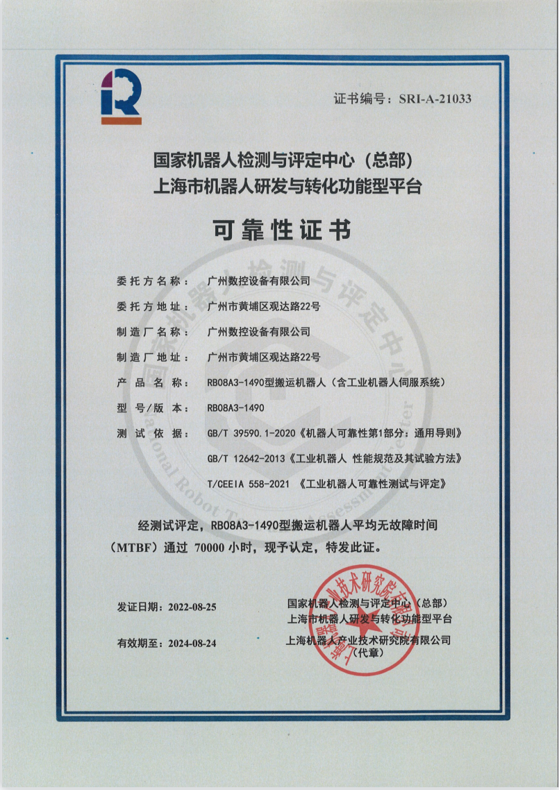 近日,广州数控设备有限公司(以下简称广州数控)RB08A3系列搬运机器人顺利通过了研究院(中国)机器人有限公司官网的 MTBF 70000小时测评。