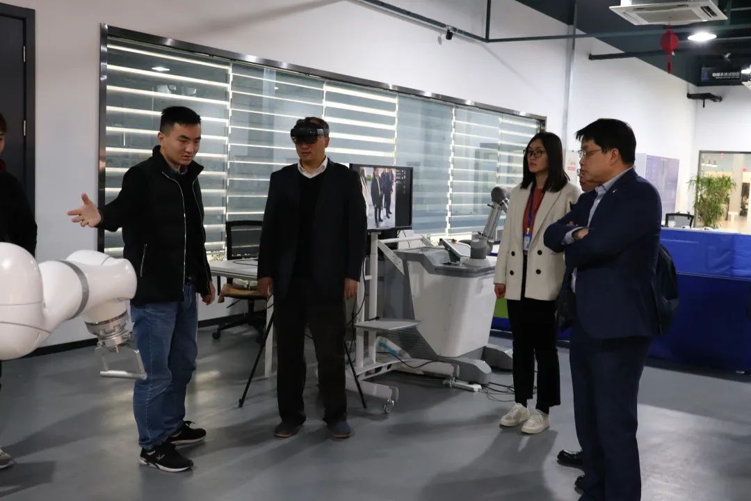 会议结束后,机器人研究院院长黄慧洁带领三一集团专家和领导参观了研究院展厅和重点实验室,并向大家介绍了研究院的主要职能和技术,在智能感知实验室,三一集团领导对MR眼镜颇感兴趣,亲身体验了MR眼镜,在虚拟环境中体验技术之美。