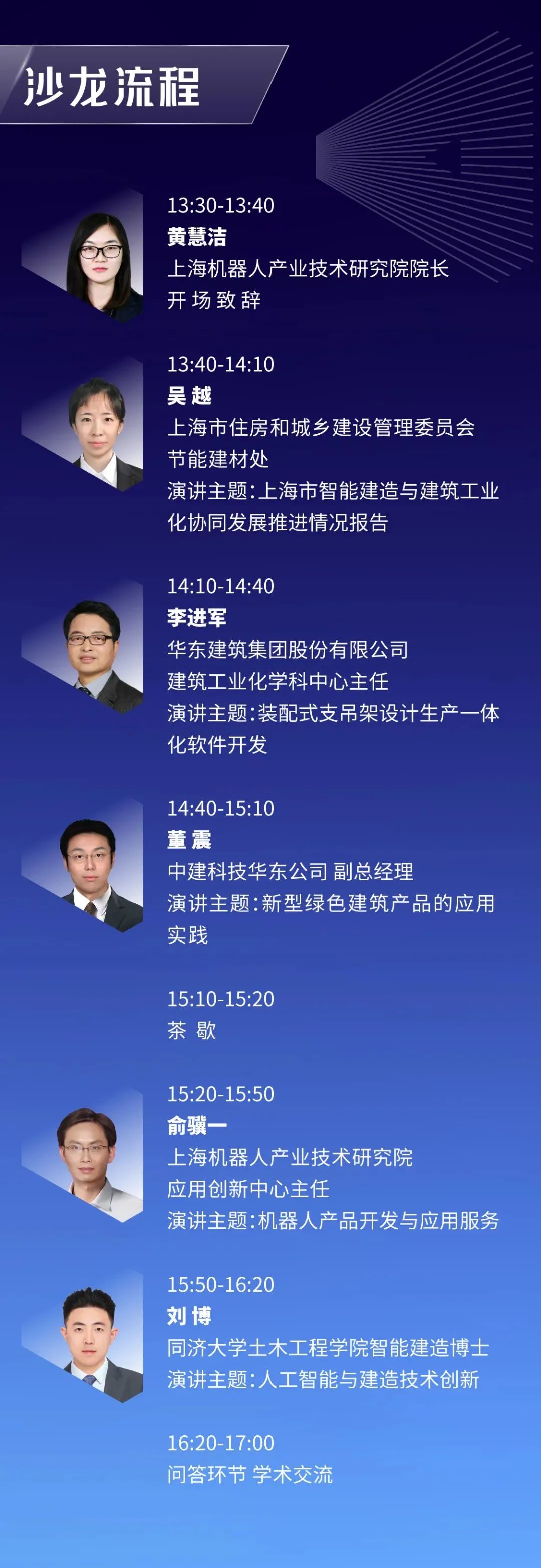 本次沙龙特邀上海市住房和城乡建设管理委员会节能建材处、研究院(中国)机器人有限公司官网、中建科技、华建集团、 同济大学土木工程学院五位大咖与大家深度分享智能建造技术与产业协同,产品与项目实践,创新与发展融合。