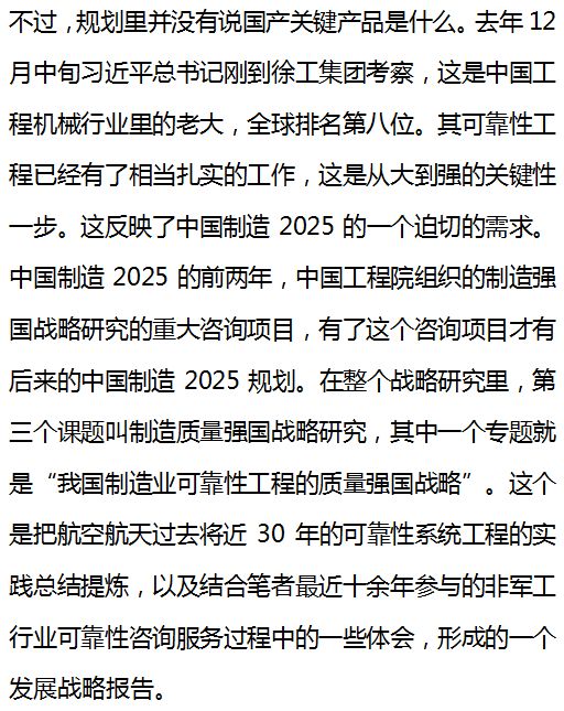透过国外工业化发展的历史和中外三个阶段的对比——生产过程、研制过程和全系统全寿命的管理,可以看出可靠性系统工程的诞生背景。实际上,这些完全对应了钱老提出来的“可靠性是设计出来的、生产出来的、管理出来的”。 中国制造要从大国走向强国之路,企业必须狠抓质量和可靠性。而系统工程抓可靠性管理是唯一的可行之路。