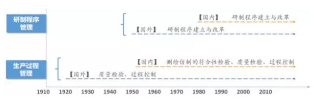 第二个对比是,国外二战期间和之后,制造过程的质量控制、质量检验做的很充分,在上个世纪50年代随着新的可靠性这些概念的出现,开始有了正向研发。美国军工行业在50年代开始建立采办程序,就是研发程序。中国以军品为代表的研发也是改革开放之后1982年才开始,有了武器装备研制程序。这个是一个非常有意义的历程。而非军工行业又比军工行业晚发展20年左右。
