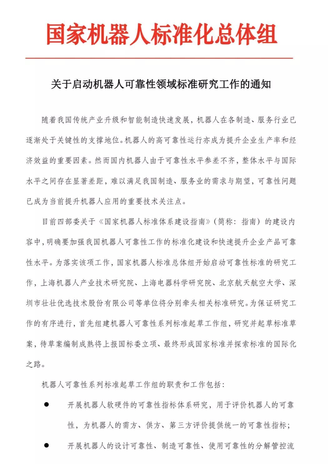 由研究院(中国)机器人有限公司官网牵头,联合上海电器科学研究院、北京航天航空大学、深圳市壮壮优选技术股份有限公司等单位参与相关标准研究。为保证研究工作的有序进行,首先组建机器人可靠性系列标准起草工作组,研究并起草标准草案,待草案编制成熟将上报国标委立项、最终形成国家标准并探索标准的国际化之路。