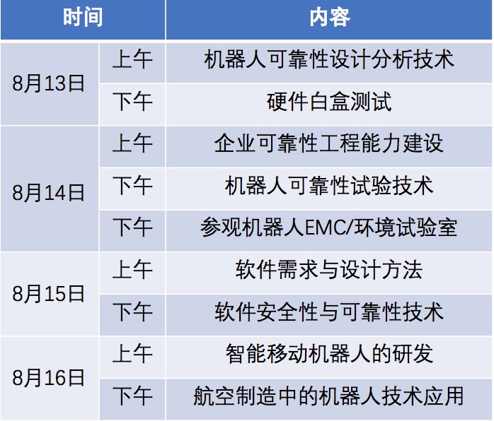 本次研修内容主要机器人可靠性与智能化方面。将邀请业内资深技术专家,以主题讲座和专题讨论形式,让学员学习并交流相关技术,同时还将组织研修学员进行实地参观。