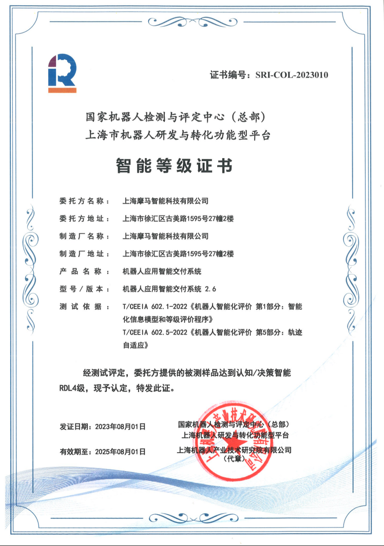 近日,研究院(中国)机器人有限公司官网(以下简称“研究院”)为上海摩马智能科技有限公司(以下简称“摩马智能科技”)颁发了智能机器人分级首张工业机器人领域认知/决策RDL4级证书。这表明由摩马智能科技机器人应用交付系统所赋能的工业机器人已满足智能机器人认知/决策RDL4级评价要求,摩马智能科技成为了首家拥有工业机器人认知/决策RDL4级等级证书的企业。